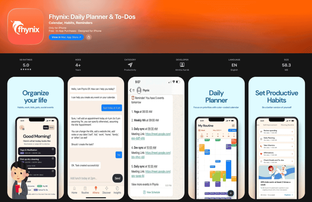 Fhynix is a daily planner, calendar & to-do app designed to help users organise life: work, self-care, kids, home tasks, habits and routines. It combines task/event addition (via text, voice, or AI/NLP), unified multi-calendar integration (Google, Microsoft, Apple), habit & routine tracking, productivity insights, colour-coded calendar view, reminders (including via WhatsApp), and support for Apple Watch (iOS) and offline mode (Android) among other features.