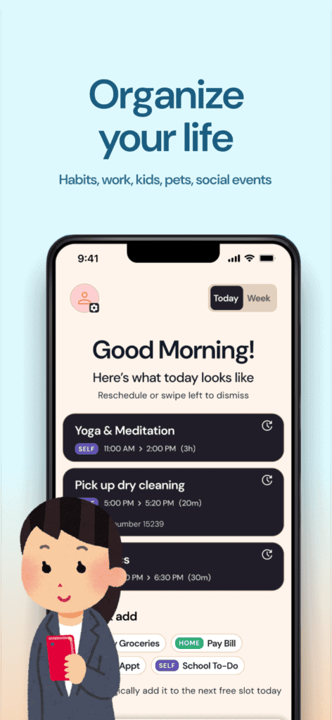 - Add tasks/events via text, voice, or AI natural language interpretation (e.g., “Pay bills tomorrow at 4 pm”).
