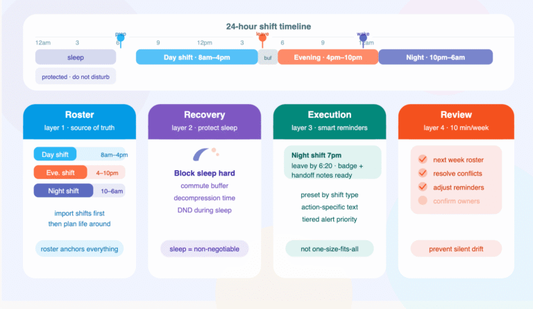 Most planner content is built around a predictable weekday rhythm. Shift work is different: sleep windows move, commute timing changes, and responsibilities at home still stay fixed. If your system cannot handle transitions and fatigue, it cannot handle shift work.